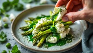 Distribuire la crema di ricotta sul fondo di un piatto piano o di una pirofila bassa usando il dorso di un cucchiaio, con un gesto circolare che crea una base irregolare — non una superficie piatta e geometrica, ma qualcosa di più vivo. Adagiare sopra gli asparagi saltati, ancora caldi, distribuendo punte e rondelle in modo che ogni boccone sia vario. Completare con qualche foglia di menta spezzettata a mano, fiocchi di sale, un filo d'olio crudo e, se si vuole, qualche scaglia di Parmigiano stagionato. Portare subito in tavola: il contrasto tra la crema fredda o a temperatura ambiente e gli asparagi caldi è parte del piatto.