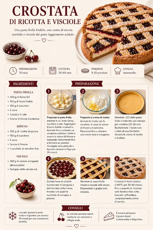 Versate il ripieno di ricotta nella base di pasta frolla, livellandolo con una spatola. Distribuite uniformemente le visciole scolate sulla superficie del ripieno, premendole leggermente affinché si adagino nella crema. Aggiungete i cucchiai di liquido delle visciole che avevate conservato, distribuendoli qua e là. Disponete le strisce di pasta frolla sulla superficie creando un intreccio a griglia, il reticolo caratteristico delle crostate tradizionali. Potete semplicemente appoggiarle parallele se preferite una versione più semplice. Sigillate bene i bordi premendo delicatamente con le dita o con i rebbi di una forchetta per creare un motivo decorativo.