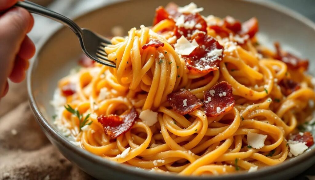 Distribuire la pasta nei piatti, assicurandosi che la crema sia uniforme. Posizionare sopra la pancetta croccante, distribuendola generosamente. Spolverare con il pecorino rimasto e terminare con una macinata generosa di pepe nero. Servire immediatamente: questa pasta non aspetta.
