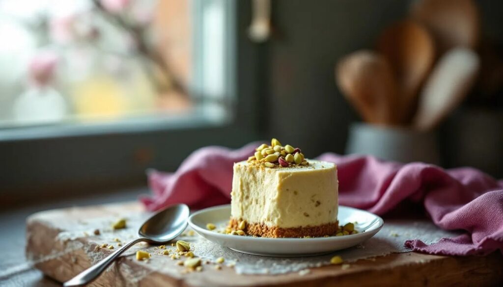 La qualità della pasta di pistacchio è il vero discriminante di questa ricetta: cercate quella di Bronte DOP, con una percentuale di pistacchio pura superiore al 95%, senza oli di palma né aromi aggiunti. Il colore deve essere verde-grigio scuro, non verde brillante artificiale. In primavera, potete accompagnare ogni fetta con una composta leggera di fragole appena sbollentate con un cucchiaino di zucchero e qualche fogliolina di basilico: il contrasto dolce-acido esalta la grassezza del pistacchio in modo sorprendente.