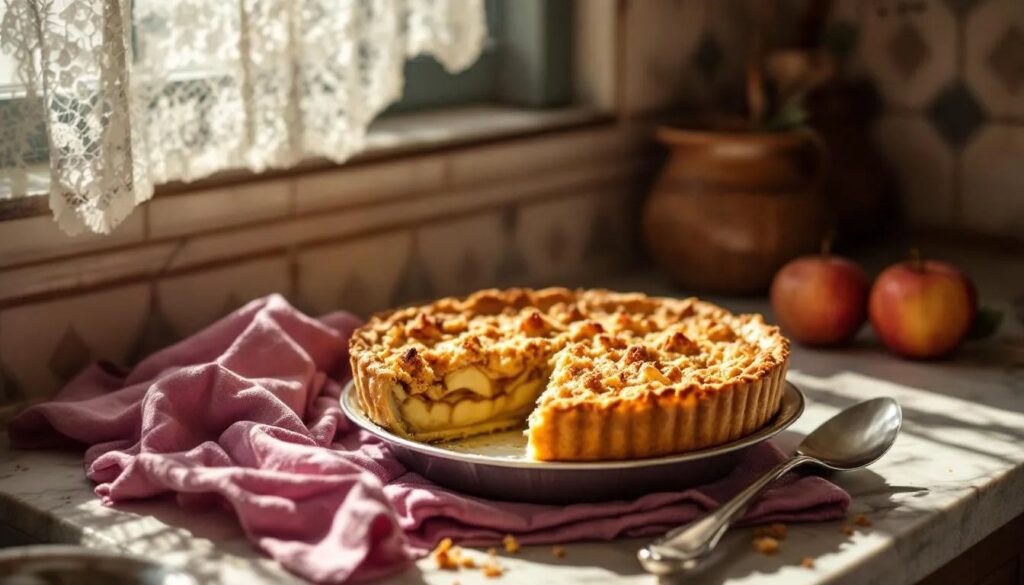 L'uso della mela annurca nella pasticceria casalinga campana è storico ma poco documentato: la torta di mele era ed è un dolce da forno domestico, preparato nelle case di provincia con quello che si aveva. La versione con crumble è una rielaborazione più recente, che prende in prestito la tecnica anglosassone dell'apple crumble e la reinterpreta con ingredienti del territorio — mandorle, olio d'oliva, un filo di cannella — ottenendo un dolce che appartiene chiaramente al Mezzogiorno pur nella sua struttura ibrida.